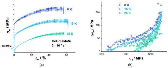 Figure 1a shows serrated plastic deformation of CoCrFeMnNi at 8, 15 and 25 K, as seen in the engineering stress–strain () curves for tensile tests. Corresponding were determined from the difference between stress maxima and minima for each serration (Figure 1b). As deformation continues, the intensity of serrations as measured by increases. Additionally, serrated plastic deformation is initiated at a lower strain at lower temperatures.