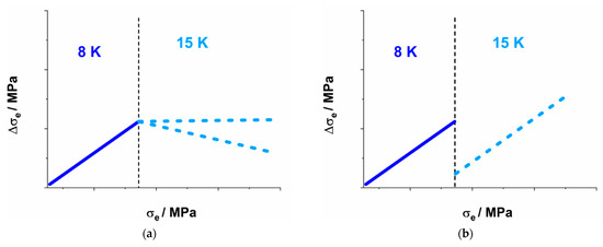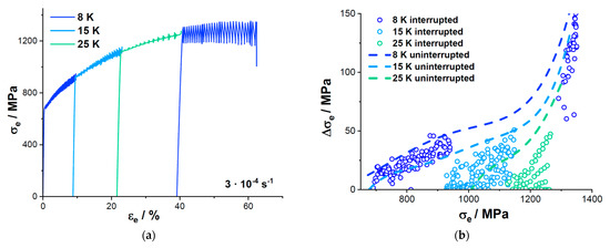 Figure 3b is clearly indicative of the trend expected for the cross-slip propensity model (compare with Figure 2b). A drop is noted for temperature changes to both 15 and 25 K. As a final verification, reloading at 8 K would result in a drastically higher post-interruption when considering cross slip [6] in comparison to a lower when considering from Equation (1) [15]. The severe increase in provides further evidence of a cross-slip-based mechanism.