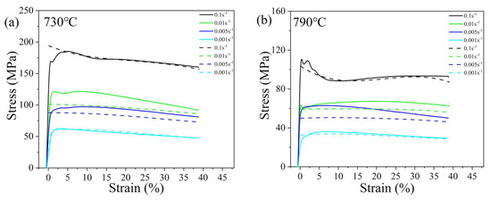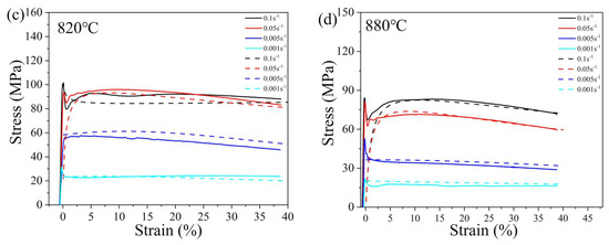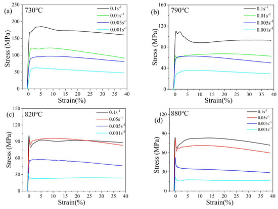 Figure 2 shows true stress-true strain curves of Ti–10V–1Fe–3Al alloy at deformation temperatures of 730, 790, 820, and 880 °C and strain rates of 0.1–0.001 s−1. In the initial stage of the experiment, the work hardening effect was much stronger than the flow softening effect. With the increase of strain, the energy stored in the microstructure was released, and the flow softening effect was strengthened. Under the action of softening mechanisms, such as dynamic recrystallization and recovery [20], the work of hardening and flow softening mechanisms reached a dynamic balance. Therefore, the general properties of the flow profile were significantly influenced by the temperature and strain rate under all deformation conditions, which divided the stress-strain diagram into a yield point phenomenon region and steady-state flow region [3,13].