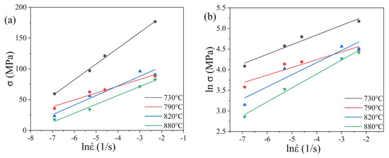 (a) Linear fitting of σ–lnέ; (b) linear fitting of lnσ–lnέ.