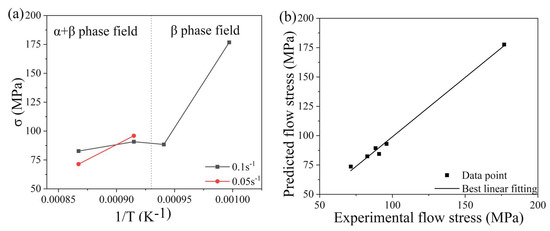(a) The relationship between the flow stress (σ) and deformation temperature (T−1). (b) Fitting relationship between the experimental flow stress and predicted flow stress, when the strain is 0.1.