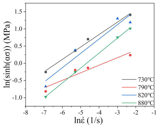 In Table 2, as the deformation temperature increases, the α value also increases. According to the Equations (1)–(3), it is found that the exponential equation can be used when the strain rate is higher than 0.05 s−1. On the contrary, the hyperbolic sine equation is adopted.