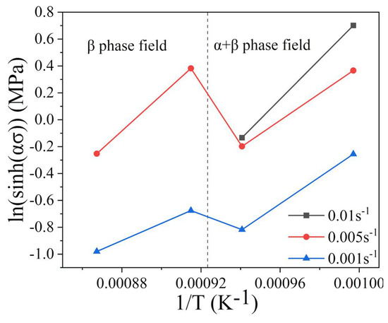 The relationship between ln(sinh(ασ)) and the deformation temperature (T−1).
