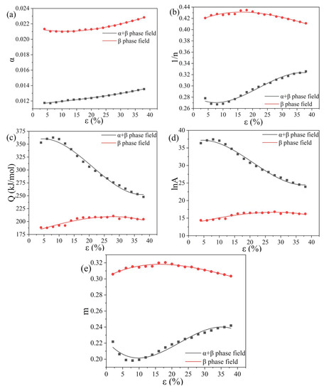 In Figure 8a, when the strain rose, the α value showed an overall upward trend. The α value differed widely in the two-phase regions. As shown in Figure 8b, the value of n increased and then decreased, and the peak value was about 4 in the α+β phase region. At the beginning of thermal deformation, the value of n rose rapidly, due to grain boundary sliding. With the increase of strain, the dislocation viscous slip mechanism gradually occupied a dominant position. In the β phase area, the value of n is always between 2.25 and 2.45. The grain boundary movement and dislocation sticking-slip mechanism played a significant role in the microstructure [32,33].
