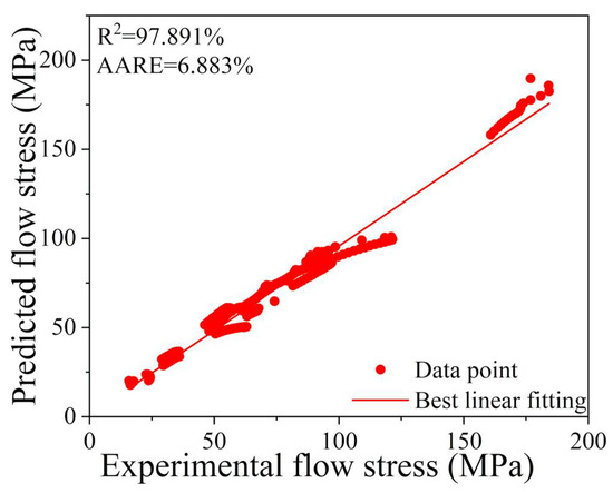 Figure 10 reflects the fit of the experimental flow stress to the predicted flow stress. The values of R2 (R) and AARE were 0.979 (98.94%) and 6.883% by Equations (26) and (27). This indicates that the two flow stresses had good coherence. It shows that the modified constitutive equation had good prediction ability.