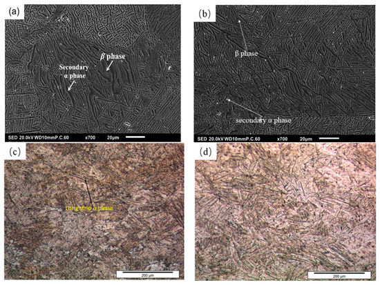 As shown in Figure 11, the microstructure is shown at different deformation temperatures at 0.01 s−1. As the temperature increased, the volume fraction of the α phase decreases gradually. The secondary α phase, formed at the α/β grain boundary, was dense, while it was relatively small in other areas of the β phase. It shows that dynamic recrystallization starts from the grain boundary and then nucleates in other areas of the β phase. With the increase of temperature, the force for the nucleation and growth of dynamic recrystallization drove more strongly, especially when it was higher than the transition temperature of the Ti–10V–1Fe–3Al alloy, and the grains have sufficient time to grow. In Figure 11c,d, the high deformation temperature played a significant role in the growth of recrystallization, and the recrystallized grains were needle-like. When the deformation temperatures were 730 and 790 °C only fine or short rod-like recrystallized grains existed. This is consistent with the changing trend of deformation activation energy at different temperatures.