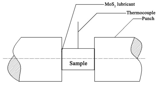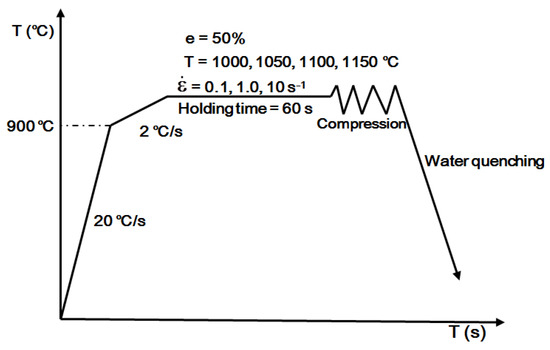 Table 1 shows the chemical composition of the studied 17-4PH steel. In order to investigate the high-temperature deformation behaviour, the 17-4PH steel was subjected to a hot compression test on a Gleeble1500D test machine (DUFFERS SCIENTFIC, Beijing, China). The sample was cylinder with a diameter of 10 mm and height of 15 mm. The schematic diagram of the hot compression test is shown in Figure 1. The sample was put into the closed chamber. Argon atmosphere was created in the chamber by pumping out the air. As shown in Figure 2, the sample was heated up to the test temperature and held for 60 s before compression. The test temperatures were 1000, 1050, 1100, and 1150 °C, respectively, according to the hot forging temperature range. The strain rates were 0.1, 1, and 10 s−1, respectively, according to actual condition. The compression rate was 50%. The temperature was measured by the R-type thermocouple (Range: 0~1600 °C, Resolution: ±1 °C) and the deformation was measured by the L-gauge system of the Gleeble 1500D test machine (DUFFERS SCIENTFIC, Beijing, China).