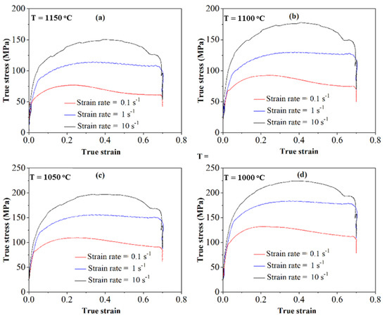 True stress–strain curves of 17-4PH steel at different temperatures and strain rates. (a) 1150 °C; (b) 1100 °C; (c) 1050 °C; (d) 1000 °C.