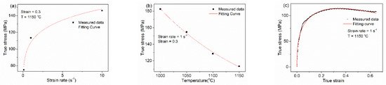 The modelling of hot deformation behaviour and the prediction of flow curves are important in metal forming processes because numerical simulation needs accurate flow description [28,29]. The most widely applied method for analysing high-temperature rheological behaviour in the literature is the model of flow stress using an expression which is related to the Zener-Hollomon parameter [30]. The stress–strain curve of hot deformation is determined by thermodynamic conditions such as , , and T [31]. For most metals, the constitutive equation of hot deformation can be expressed as a general equation: