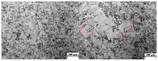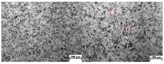 The second group: a billet with a diameter of 200 mm was heated for the first time and was simply pre-formed after upsetting. Then it was put into the resistance furnace for a second heating (refer to the actual production process, 30 min of hot insulation). After final forging, solid solution treatment at 1040 °C and hot insulation for 1h was carried out. The microstructure after water cooling is shown in Figure 7.
