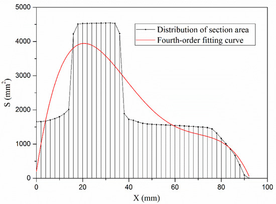 In actual production, there were many plate shape parts with different specifications. A rapid design method of pre-form blank was discussed based on the shape characteristics of parts and numerical simulation analysis. The parts were symmetrical, so half of them were taken for research. From the middle, a section was taken every 2 mm along the horizontal direction. The section area is shown in Figure 9 and its fourth-order fitting curve is also shown. It could be used to obtain the shape of a preformed blank quickly, and the analysis is as follows:
