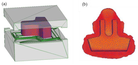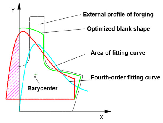 If the average true strain in the component is 30%, the fourth-order fitting curve is shown in Figure 11. The area formed by this curve and the x-axis was the area of the fitting curve. We superposed the barycentre of this area and the barycentre of the 3D model to coincide with the shade formed by the Y-axis and area of the fitting curve, that was added to the upper part for volume conservation. According to the external profile of forging, the blank shape was appropriately modified. The optimized blank outline is shown in Figure 11. The numerical simulation was conducted via Deform-3D software (DUFFERS, Beijing, China). Here 40,000 grids were meshed for the pre-formed blank. Re-meshing was also proceeded automatically with the calculation. The analysis model of final forging is shown in Figure 12a. For the simulation condition, the heating temperature is set as 1050 °C and the mould temperature is 200 °C. The ram speed is 200 mm/s. The friction coefficient is 0.25 according to experience and comparison with previous paper [41]. The result of the numerical simulation is shown in Figure 12b.