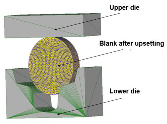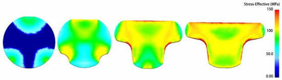 There were many factors affecting the billet process of the T-shaped blank [42]. In order to minimize the instability factors, a graphite lubricant was used as its friction coefficient is relatively fixed. The shape and size of the lower die was fixed so that only two factors of blank diameter and thickness needed to be optimized. With relatively few analytical variables, it was easy to conclude from multiple sets of data that a billet with a diameter of 136 mm and a thickness of 35 mm should be used. The blank deformation process is shown in Figure 15. As the blank was irregular after forming (Figure 14b), the blank might be unstable in the final process. Therefore, it should be slightly flattened after the pre-formed process.