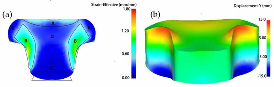 After obtaining the T-shape blank, the forming of the blank was studied, as shown in Figure 13. For numerical simulation analysis of the blank of T-shaped parts, the distribution of the deformation field is shown in Figure 14a. Region B was the severe deformation area. From the beginning to the end of deformation, the metal in this area flowed continuously and strongly to both sides under a friction force since both sides were free. Region D was continuously subjected to upsetting deformation, and its wall thickness was continuously thickened. Region C was triangular in shape and had a small deformation. Therefore, the T-shaped blank presented the geometric shape shown in Figure 14b, which was more conducive to the filling of materials in the U-shaped area of the product.