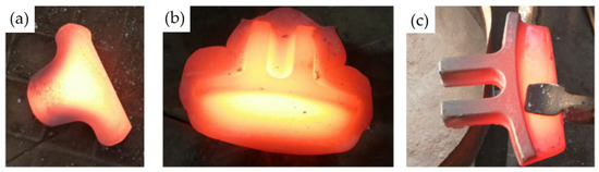 According to the above analysis, we determined the deformation process of round steel blanking, upsetting, pre-forging, flatting, final forging, and trimming. The high-precision box furnace with temperature control precision ±3 °C was used as heating equipment, the 400T punch machine (J31-4000KN, Beijing Research Institute of Mechanical & Electrical Technology Ltd., Beijing, China) as blank making equipment, the 3T forging hammer (C88K-50, Beijing Research Institute of Mechanical & Electrical Technology Ltd., Beijing, China) as final forging equipment, and the 400T punch press as trimming equipment (Beijing Research Institute of Mechanical & Electrical Technology Ltd., Beijing, China). 17-4PH round billet (Beijing Research Institute of Mechanical & Electrical Technology Ltd., Beijing, China) with a diameter of 100 mm and length of 65 mm was put into the furnace. The initial forging temperature was 1180 °C. The billet was subjected to upsetting deformation and the size after upsetting was a round cake with a diameter of 136 mm and length of 35mm. Then T-shaped blank was obtained after pre-forging. The forging process was completed within two rounds of heating and two steps of forging. After the first heating, upsetting and pre-forging were completed, as shown in Figure 16a. After the second heating, flatting, final forging (Figure 16b), and edge cutting (Figure 16c) were completed. The final forging temperature was 950 °C. The actual test-formed forgings not only met the requirements of microstructure, but the material utilization rate was also greatly improved. High-performance near net forming of 17-4PH steel was realized.
