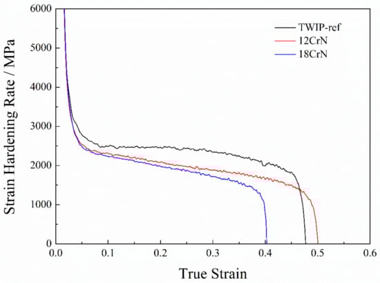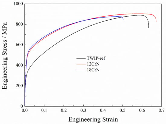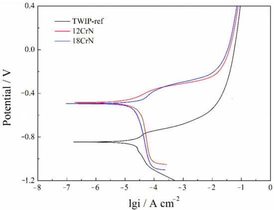 - Compared with the TWIP-ref steel, the Fe–Mn–Cr–CN TWIP steels have better mechanical properties and corrosion resistance. The strain-hardening rate of 12CrN steel is lower than that of the TWIP-ref steel because of the relatively late generation of high-density deformation twins, which resulted in less tensile strength increments during the tensile test. The yield strengths of the 12CrN and 18CrN samples are 496 and 512 MPa, respectively, which are much higher than that of the TWIP-ref sample (308 MPa). Moreover, the Fe–Mn–Cr–CN steels have more excellent anticorrosion properties. The Ecorr values of the 12CrN and 18CrN samples are −483 and −494 mV, respectively, which are more positive than that of the TWIP-ref sample (−845 mV), and the Icorr of the 12CrN sample (1.4707 × 10−6 A·cm−2) is significantly smaller than that of the TWIP-ref sample (2.9027 × 10−6 A·cm−2);