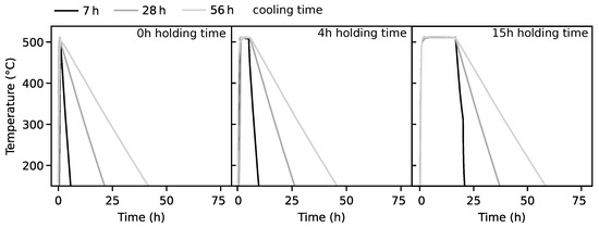 Temperature-time profiles of the aging heat treatments with 0 h, 4 h and 15 h aging time and with 7 h, 28 h and 56 h cooling time.