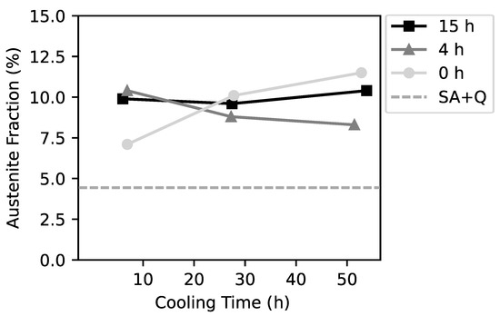 Figure 2 shows the austenite fractions of all aged conditions. All samples had similar austenite fractions within a range between 7.5% and 12.5%. In the SA + Q condition the austenite fraction was measured and evaluated to be 4.4%. The trend shows an increasing austenite fraction with longer cooling times for the samples with 0 h aging time. For the 4 h and 15 h holding time samples the austenite fraction remained constant within the experimental uncertainty. EBSD revealed that the mean martensite block size was 7.6 m in the SA + Q condition and between 5.6 m and 7.6 m in the aged conditions. No difference of the matrix microstructure was found between the aged conditions, as shown in Figure 3 for the 0 h aging time samples.