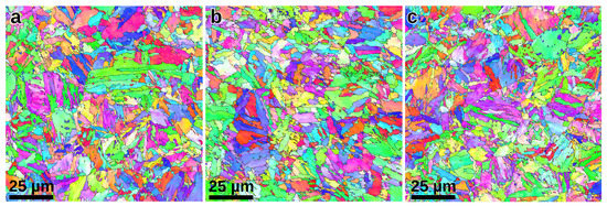 300 MPam−1/2 is the Hall-Petch constant that was determined for maraging steels [21], is the average martensite block size, is the shear modulus of Fe (80.4 GPa [22]), b is the magnitude of the Burgers vector (0.268 nm [21]), is the dislocation density and and are the solid solution factor and the molar fraction of each alloying element. The strength contribution stemming from the dislocation density () was calculated as the difference between the total strength and the sum of the contributions from solid solution strengthening and grain size strengthening. With the value for the dislocation density was estimated with from Equation (2). The solid solution factor was determined using Equation (4) according to Fleischer’s formula [21].