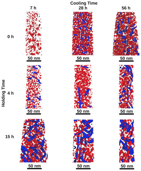 Iso-concentration surfaces showing the precipitate evolution with respect to the cooling time for the 15 h, 4 h and 0 h aged samples. The -NiAl and -Ni3(Ti,Al) phases are represented by 30 at.% Ni + Al (red) and 65 at.% Ni + Ti + Al (blue) iso-concentration surfaces, respectively. For the 0 h aging time samples 25 at.% Ni + Al (red) and 40 at.% Ni + Ti + Al (blue) iso-concentration surfaces are used to represent the -Ni3(Ti,Al) and -NiAl phases, respectively.