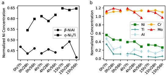 (a) Concentration of Ni in the precipitates, normalized to the total concentration of Ni, Ti and Al. (b) Concentration of the alloying elements in the matrix phase, normalized to the average bulk composition.