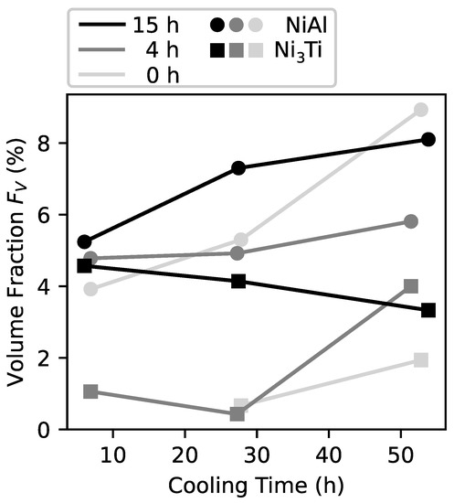 The APT results (Figure 4 and Figure 6) showed that the formation of precipitates is influenced the most by the cooling time for the samples aged for 0 h and 4 h. For a aging time of 15 h both types of precipitates (-NiAl and -Ni3(Ti,Al)) are already well-developed before the cooling process. For this sample group the volume fraction of -NiAl increases with increasing cooling time, while the volume fraction of -Ni3(Ti,Al) decreases. After 4 h of aging only a small volume fraction of -Ni3(Ti,Al) is precipitated, when a cooling time of 7 h or 28 h is used. If the cooling time is increased to 56 h, also the 4 h holding sample group showed fully-developed -Ni3(Ti,Al) precipitates with volume fractions similar to the 15 h aged sample group. The samples which were immediately cooled after reaching the aging temperature (0 h holding time) showed fully developed precipitates with 28 h and 56 h cooling time. For the 0 h aging time samples, 7 h of cooling time was sufficient to form only clusters and small particles with different morphology and a chemical composition with similar concentrations of Ni and Ti + Al (Figure 5b). From the observed precipitate evolution it can be concluded that the large Ni, Ti and Al rich particles that were observed in this condition correspond to early stages of -Ni3(Ti,Al), while the small spherical precipitates correspond to the -NiAl phase. In addition to the -NiAl precipitates, the 28 h cooled sample also showed rod-like precipitates with a chemical composition consisting of approximately equal parts of Ni and Ti + Al. This phase can be considered as an incomplete stage of -Ni3(Ti,Al). Compared to the samples with 15 h and 4 h aging time the -Ni3(Ti,Al) phase is not well-developed in the 0 h aging time samples and the volume fraction is comparatively low. This is because the formation of -Ni3(Ti,Al) typically requires longer aging times and forms in a higher temperature range than -NiAl. In short, a longer cooling time results in a progressing precipitation reaction. If both types of precipitates are fully formed after holding (15 h sample group) the total volume fraction of precipitates remains constant, but a shift from a balanced distribution of -Ni3(Ti,Al) and -NiAl to a distribution with more -NiAl can be observed.