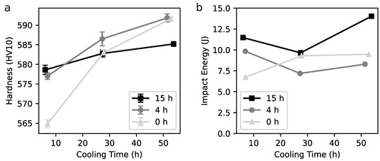 Figure 7a shows that the hardness of the materials increased with increasing cooling time for all 3 aging times. The hardness of the alloy in SA + Q condition was 324 HV10. The increase of hardness with longer cooling time was the strongest in the samples with 0 h aging time and the weakest in the samples with 15 h aging time.