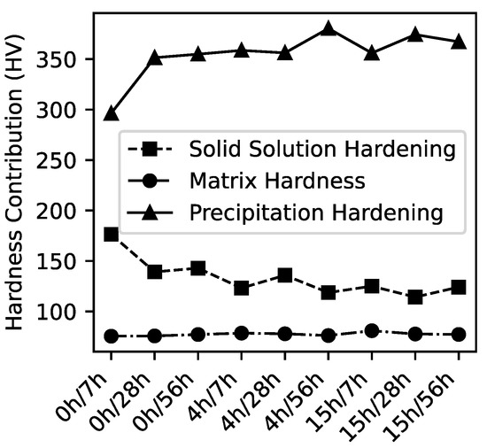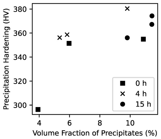 The calculation of the individual contributions to the hardness of the aged alloy showed that the precipitation hardening was within a range of about 350 HV to 380 HV for most conditions (Figure 8). Figure 9 shows the correlation between the volume fraction of precipitates and the precipitation hardening effect. A trend of increased precipitation hardening with a higher volume fraction of precipitates could be observed for all samples and within each aging time group. The strongest precipitation hardening effect was found in the 4-56, 15-28 and 15-56 conditions. This stems from the high volume fraction of precipitates found in these conditions. The weakest contribution of the precipitation hardening to the total hardness was observed for the 0 h aging time sample group. However, due to the comparatively low volume fraction of precipitates a high solute content is present in the matrix. Therefore, a higher contribution from solid solution hardening to the total hardness is present in these conditions. The high hardness that was observed in the 0-56 conditions stems from a well-balanced combination of precipitation hardening and solid solution hardening.