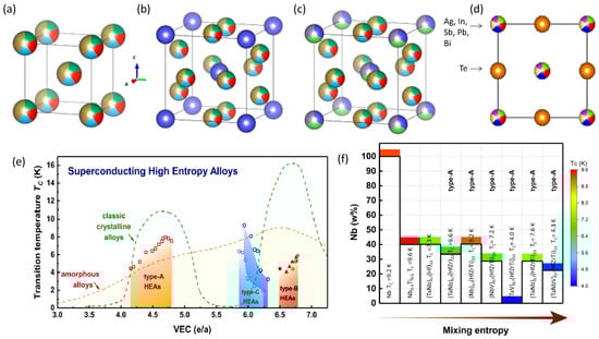 Possible crystal structures of HEAs: (a) body-centred cubic, (b) A15 structure (CrSi-type) with HEA on the Si-site and (c) full A15 HEA. The multicoloured atoms indicate that the site is randomly occupied; solid lines represent the unit cells. Reprinted with permission from Ref. []. (d) presents a HEA with a cubic NaCl-type structure, where the different metals occupy one (cationic) site in a shared fashion, and the other (anionic) site is only Te. Reprinted with permission from Ref. []. (e) VEC dependence of for bcc HEA superconductors (data). The red-dashed (◼ ◼ ◼ ◼ ◼) and green-dashed (◼ ◼ ◼ ◼ ◼) lines give the VEC for crystalline 4d metal solution and amorphous 4D metal alloy superconductors, respectively. (f) shows the entropy effect in type-A HEAs compared to Nb and NbTi. (e,f) Reprinted with permission from Ref. [].