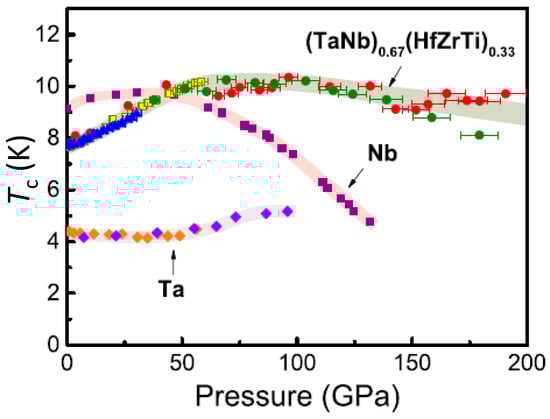 The availability of the superconducting HEA material has triggered high-pressure experiments to learn more about the phase stability and the influence of high entropy under applied pressure. Thus, experiments were carried out on the bcc lattice HEA (Nb,Ta)(Zr,Hf,Ti) material, with a of 7.8 K at ambient pressure, using diamond anvil cells, with the possibility to record data in applied magnetic fields as well as crystallographic information []. The results obtained are presented in Figure 3 and could be compared with existing data in the literature of the superconducting constituents Nb and Ta. The remarkable result obtained in these experiments is the demonstration of the outstanding stability of superconductivity in this HEA system—up to ∼190 GPa—manifested by volume compression of 53% (190 GPa) and maintaining at about 9 K, and the upper critical field, at ∼2 T, at this pressure. These observations unambiguously show that the electronic configuration of the HEA is clearly distinct from the elemental superconductors, Nb and Ta, contained in this HEA.