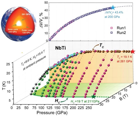 Superconductivity of the NbTi alloy under various applied pressures and in various applied magnetic fields shown as a 3D plot of pressure (horizontal axis), temperature (vertical axis), and magnetic field. The solid orange line indicates the determined values (coloured balls represent obtained from different experimental runs), and the solid green line represents the behaviour of the upper critical field as function of temperature, . The black, green, and red symbols (●, ●, ●) represent obtained in zero field and various applied magnetic fields. Furthermore, the pressure dependence of the molar volume is given as well (, where is the volume at fixed pressure and is the ambient pressure volume), the squares (□, □) represent the results obtained from the two independent runs. The red star (🟉) labels the value at 261 GPa, the green star (🟉) marks the upper critical field at 1.8 K, and the blue star (🟉) refers to the relative volume at the highest pressure investigated. The top left panel displays that the maximum pressure of this study falls in that of outer core of the earth. Reprinted with permission from Ref. [].