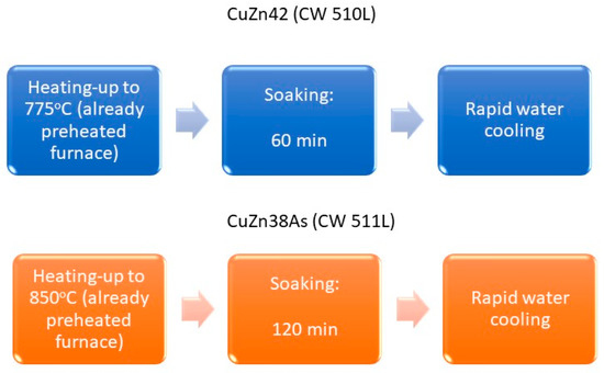 Simple schematic diagram showing the performed heat treatment processes (blue blocks for CuZn42 and orange blocks for CuZn38As alloy samples). Heat treatment conditions—CuZn42: 775 °C for 60 min followed by water quenching; CuZn38As: 850 °C for 120 min followed by water quenching.