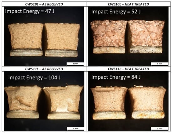 Macroscopic fracture surfaces after impact fracture toughness tests (Charpy) before and after heat treatment of CW510L and CW511L brass alloys. The average values of the induced impact energies are referred too.