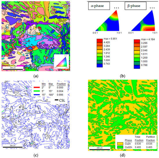 The texture and volume fraction percentages of the α- and β-phases in CuZn42 were determined by EBSD (see Figure 3 and Table 3). A (111) fibre structure was exhibited by the α-phase and a single (101) fibre with minor (335) preferred orientations structure was observed by the β-phase (see Figure 3a,b). The results showed a 46 vol.% fraction for the fcc (α-phase) and a 54 vol.% fraction for the bcc (β-phase) (see Figure 3d).