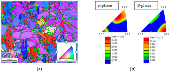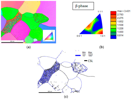 The α-phase appeared in various forms, mainly exhibiting an allotriomorphic morphology nucleated on the β-phase grain boundaries, but also as coarse intra-crystalline “islands”, typical of a slow cooling rate from a hot working temperature (Figure 3a). The mean grain size of both the α-phase and β-phases was 25 μm. A large fraction (20%) of the α-phase grains exhibited thermal or annealing twins. The microstructure was characterized by the presence of almost exclusively high angle grain boundaries (see Figure 3c and Table 4). No sub-grains (2–5 degrees) were detected, while low angle boundaries (5–15 degrees) were almost null and were located exclusively on α–α interface boundaries (see the green lines in Figure 3c). The high angle boundaries included 19% CSL boundaries, consisting of 10% Σ3 and the remaining 9% distributed to other CSL categories. All CSL high angle boundaries were related to the α-phase, while approximately half of them were located on α–β interphase boundaries, with the other half on α–α boundaries.