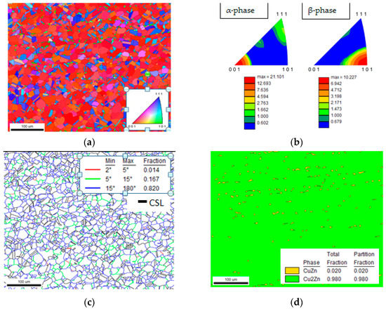 CuZn38As alloy in the heat treated condition. (a) Inverse pole figure (IPF-Z) map and (b) texture plot. (c) Misorientation and (d) phases map. Note: CuZn (β-phase), Cu2Zn (α-phase). Unit: μm.