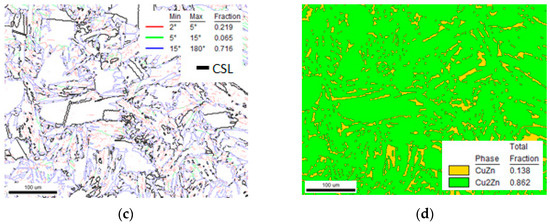 After the heat treatment, the microstructure consisted merely of macroscopic size (several thousand μm, i.e., mm) β-phase grains, while any α-phase precipitation had been suppressed by the rapid water quenching (Figure 4 and Table 3). A double (101) and (113) fibre structure was exhibited by the single β-phase alloy (Figure 4b). Exclusively high angle boundaries were observed (Figure 4c). The β-phase exhibited poor quality in EBSD scans in most of the grains, which rendered difficulties in processing the respective maps. This could be attributed to (i) the disorder–order transformation which led to fine ordered domain size and multiple orientations within a single grain or (ii) due to the minute lattice parameters deviation between the β- and β’-phase, which could not be resolved by the EBSD technique [36]. Interestingly, the examination showed that approximately 20% of the grain boundaries were CSL, with the higher percentage being Σ3 and the remainder being Σ7, Σ15, and Σ21 (Table 4). The coarse grain size is an indication of the exaggerated grain growth which took place during the heat treatment of the brass rod.