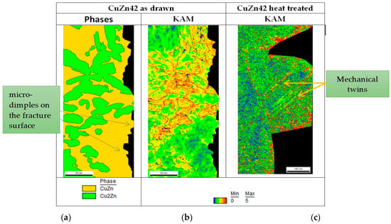 Phase and KAM maps of the fracture surface profile of Charpy impact tested CuZn42 alloy samples: (a) phase map, (b) KAM map in the as-drawn condition, and (c) KAM map in the heat treated condition. Unit: μm.