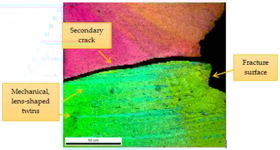 In Figure 8, lens-shaped twins are shown extending across the width of the grain (deformation twins do not extend to adjacent grains). This is the main existing deformation mechanism exhibited by the coarse, single β-phase brass alloy, since the crack tip created a limited plastic zone size compared to the grain size, hindering the activation of multiple sets of slip systems in adjacent grains, and dislocation emission was impeded by the existing microstructural barriers, causing dislocation pile-up to the activated slip systems and grain boundaries [37]. Twinning behaviour in bcc alloys is considered important in orientation changes that enable the activation of new slip systems in order to allow deformation by slip. In the intergranular crack, shown in Figure 8, on both the fracture surface and across the secondary crack, no appreciable deformation has occurred, leading to the hypothesis that mechanical twinning produced by the shock loading was the predominant deformation mechanism, explaining the reason for the uniform misorientation values for the same grain close and far from the fracture surface.