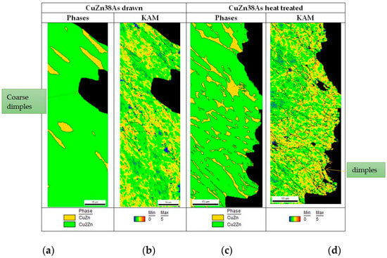 Phase and KAM maps of the fracture surface profile of Charpy impact tested CuZn38As alloy samples in the (a,b) as-drawn and (c,d) heat treated conditions. Unit: μm.