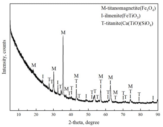 The raw materials of LVTC were supplied by a mineral processing plant in Chaoyang, Liaoning Province, China. The chemical compositions of LVTC were determined by X-ray fluorescence (XRF)(XRF-1800, Shimadzu Corporation, Kyoto, Japan) and chemical methods; the grain size of this analyzed powder was less than 200 mesh, and the results are presented in Table 1. The LVTC contained not only a great deal of Fe, Ti, Si, and Ca, but also a lot of Al, V, and Mg, as well as other valuable elements. The total content of Fe was 43.75%—far lower than 57%, which is the accepted minimum feed Fe grade for blast furnace ironmaking. Moreover, the content of TiO2 was as high as 17.33%, which increased the viscosity of molten iron and hindered the smooth running of blast furnace. The XRD patterns of the LVTC are displayed in Figure 1, indicating that the LVTC is mainly composed of titanomagnetite, ilmenite, and titanite, and the peak shapes of these three minerals show a dramatic correlation. As shown in the results of chemical phase analysis of Fe and Ti in Table 2, Fe was mainly distributed in titanomagnetite, reaching 83.09%, while titanium was mainly distributed in titanomagnetite and ilmenite, at 50.79% and 37.68%, respectively. Therefore, it is also clear that efficient recovery of Fe and Ti is overwhelmingly achieved by the separation of titanomagnetite and ilmenite, and that grinding and magnetic separation are indispensable operational units.