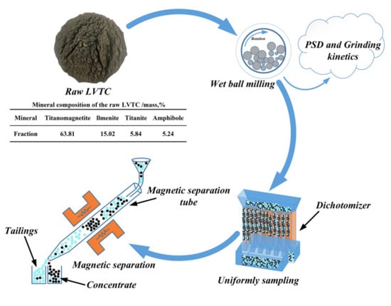 Based on the analysis of special mineralogical properties, the grinding kinetics of the LVTC were investigated using fine grinding, and magnetic separation was used to separate and recover valuable components such as Fe and Ti in this study; the following conclusions were obtained: