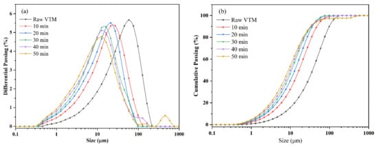 The PSD of raw LVTC and products obtained from various grinding times, as determined by laser particle size analyzer, is shown in Figure 3, which shows that the particle size of LVTC powder decreases and the particle distribution becomes narrower as the grinding time increases. The maximum particle size of all ground products was 163 μm, and the particle size of ground LVTC was less than 86.4 μm after grinding for more than 20 min. In addition, the PSD curve shifted to the left as the grinding time increased, and subpopulations appeared when the grinding time reached 40 min. The subpopulations of material grinding for 40 and 50 min occurred from 86.4 to 144 µm and 310 to 666 µm, respectively. These subpopulations are believed to be caused by particle agglomeration.