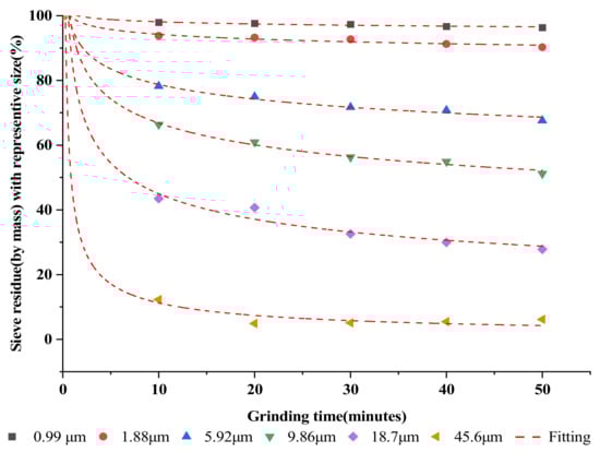 According to the specific grinding experiment data in Figure 3, and to verify the reasonableness of the above equation in describing the grinding process of the LVTC, six representative sieve sizes (0.99, 1.88, 5.92, 9.86, 18.7, and 45.6 μm) were selected, and the sieve residues (by mass) of particles with the six representative sieve sizes were calculated, and are listed in Table 3. Furthermore, the sieve residues of particles with the six representative sieve sizes are shown in Figure 4 and fitted as a function of grinding time according to Equation (2). The fitting curves and the parameters are presented in Figure 4 and Table 4, respectively.