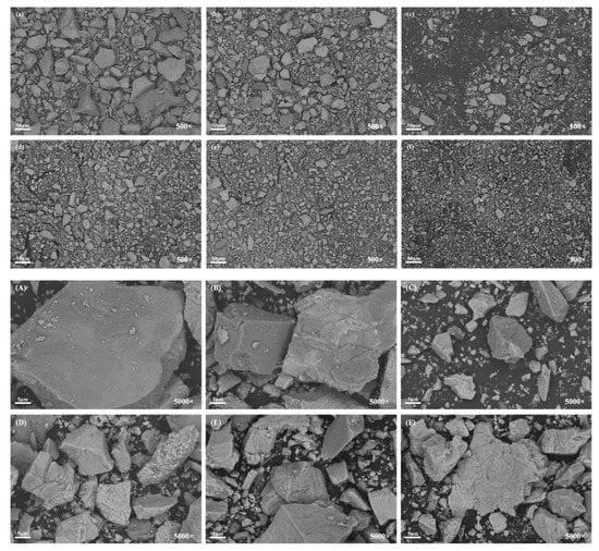 The morphological variation of raw LVTC and ground particles with increasing grinding time is depicted in Figure 5. The particle morphology of the raw LVTC and ground products is shown in the top portions (a–f) and lower portions (A–F) of Figure 5 at 500× and 5000× magnification, respectively. The particle morphology of raw LVTC is mostly irregular block-, clastic-, angular-, and granular-like shapes, and tiny particles with a clastic-like shape are absorbed on the surface of coarse particles with block or angular morphology due to electrostatic interaction (Figure 5a). As the grinding period approaches 10 min, the surface morphology of the particles becomes slightly coarser, and as the grinding time increases, the surface morphology becomes rougher. Furthermore, when the grinding time rises from 0 min to 20 min, the particle size reduces dramatically, while the SSA increases sharply. All of these phenomena mentioned above increase the likelihood of tiny particles coming into contact with one another, promoting aggregation. According to Figure 5c–f, as the grinding time increases, the number of fine particles decreases, then slightly increases, indicating that increasing the grinding time cannot reduce the particle size indefinitely, which could also explain why subpopulations appear in the PSD curve (Figure 3) when the grinding time exceeds 30 min. Furthermore, for the sample ground for 50 min, it is difficult to find particles larger than 100 µm, corroborating the PSD results.