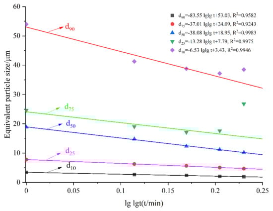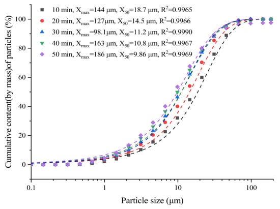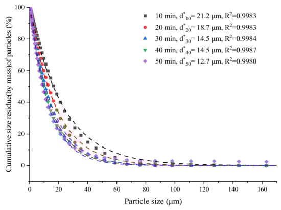 As shown in Figure 4, the variation trend of the experimental data is very consistent with that described by Equation (2), which also can be verified by the high R2 values in Table 4. Specifically, the grinding kinetic equation (Equation (2)) can describe the grinding process of the LVTC very well. In addition, a rapid decrease in particle size was observed during the first 10 min of grinding, followed by a slowdown, indicating that the coarse particles were ground more efficiently than the fine particles during the grinding process. After 30 min, the sieve residue of the particles approached a constant value, which may be the result of an equilibrium between the fragmentation and agglomeration processes.