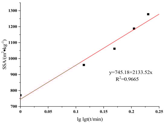 Relationship between the SSA of LVTC powder and the double logarithm of grinding time.