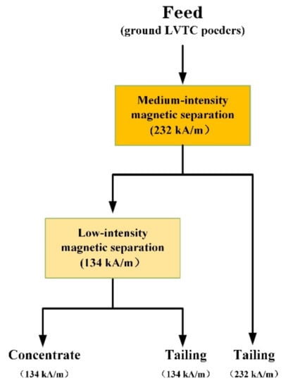 Magnetic separation is considered to be the most reasonable technology for the recovery and processing of vanadiferous titanomagnetite [,]. In this study, about 21.19% of the gangue minerals in LVTC were single-gangue minerals with large particle sizes, such as quartz, tremolite, and feldspar, as well as fine-grained gangues linked with titanomagnetite, and veinlets and checkerboard ilmenite in titanomagnetite that produce a solid solution [,]. Magnetic separation was used in this work to separate titanomagnetite, ilmenite, and other gangue minerals from LVTC in order to isolate Fe and Ti. The flowchart of the magnetic separation process of ground LVTC powder is shown in Figure 10, with magnetic field intensities of 232 kA/m and 134 kA/m for the two-stage magnetic separation.