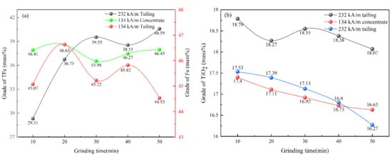 Effect of grinding time on the grade of (a) TFe and (b) TiO2.