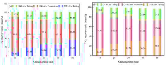Effect of grinding time on recovery ratio of (a) Fe and (b) TiO2.